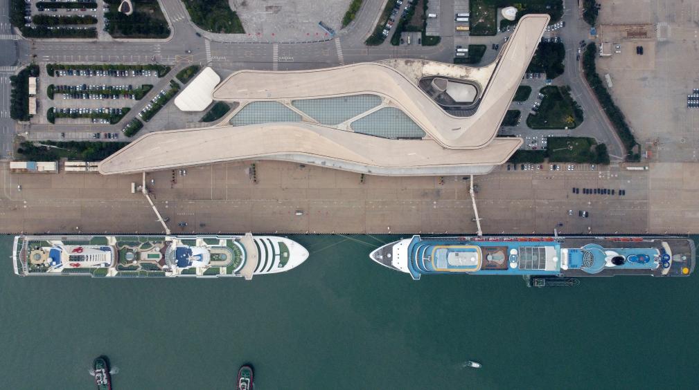 9月27日,“梦想”号邮轮(左)、“地中海”号邮轮靠泊在天津国际邮轮母港准备启航(无人机照片)。新华社记者 赵子硕 摄