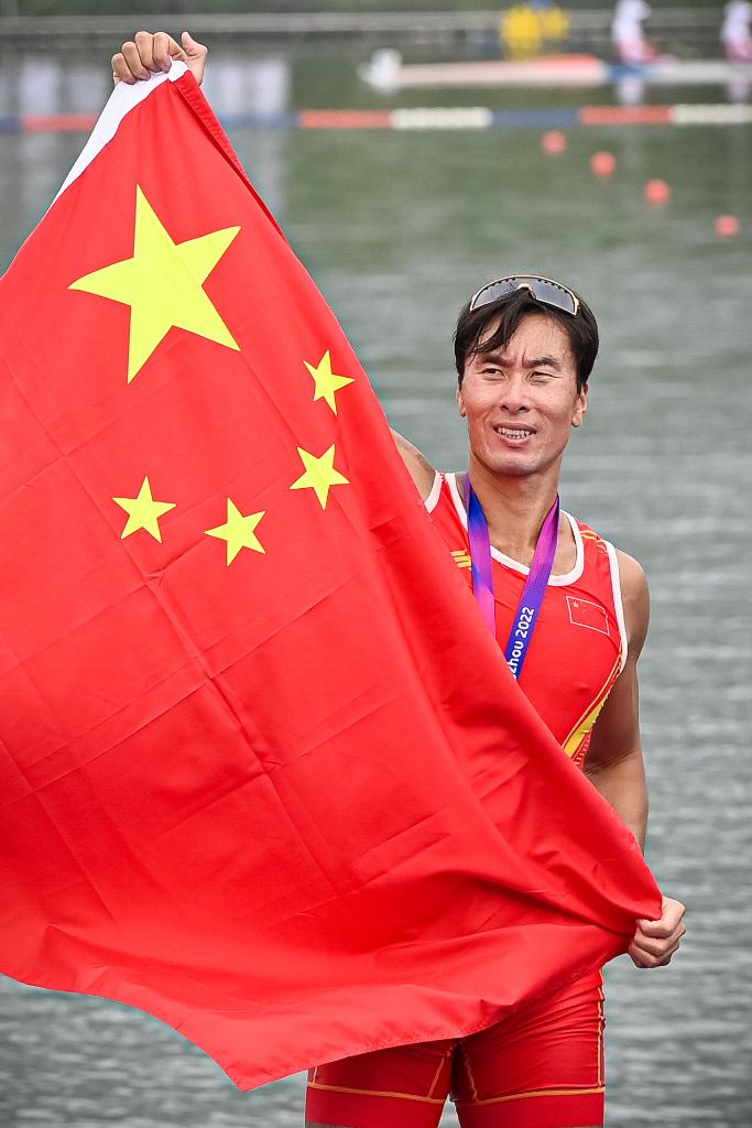 9月25日,在杭州亚运会男子单人双桨决赛中,张亮以6分57秒06的成绩夺得冠军。新华社记者 江汉 摄