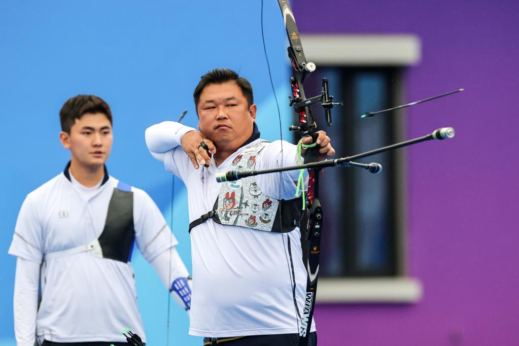 10月6日,在杭州亚运会射箭项目男子反曲弓团体比赛中,韩国组合李雨锡/吴真赫/金济德获得金牌。图为吴真赫(右)在比赛中。新华社记者 单宇琦 摄