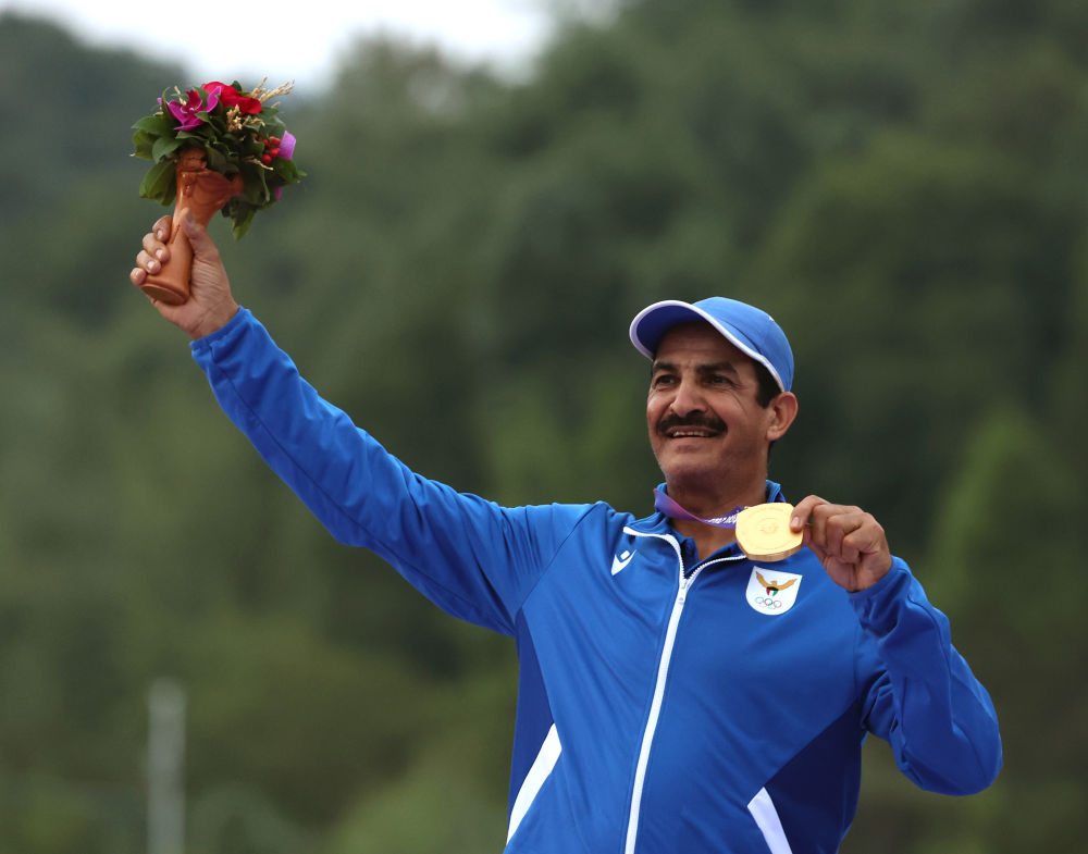 9月27日,金牌得主科威特选手阿卜杜拉·拉希迪在杭州亚运会男子双向飞碟个人赛颁奖仪式上。新华社记者 杜潇逸 摄