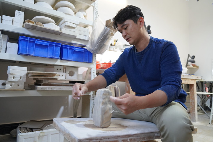 韩国陶艺家姜东弦在位于景德镇珠山区李家坳村的工作室内创作。王中庆 摄