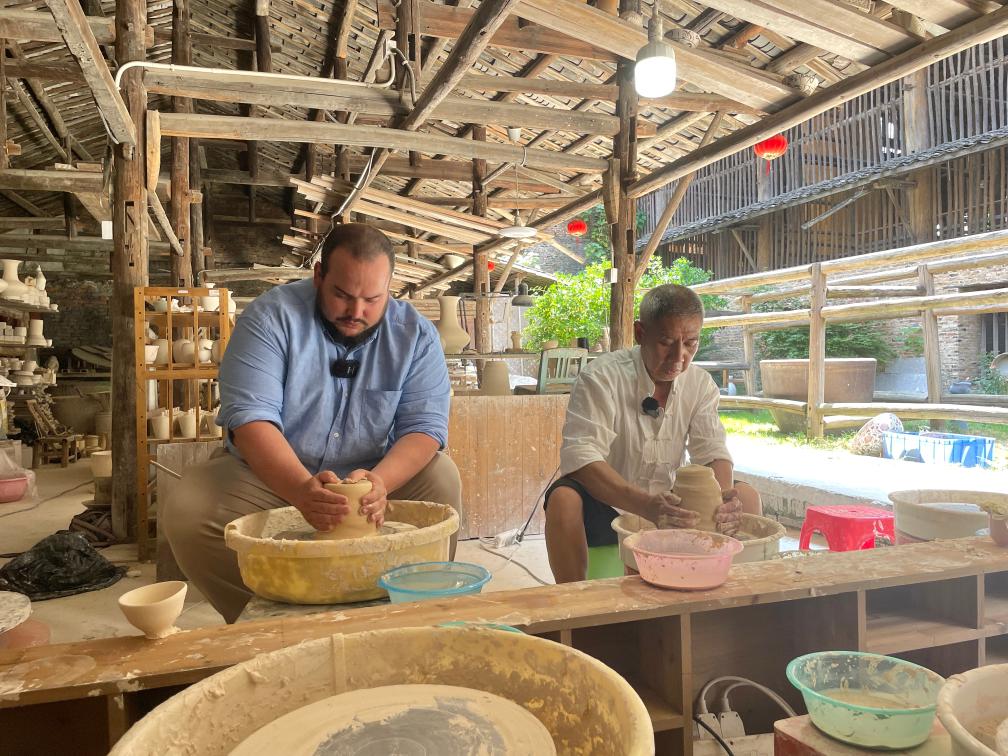 图为非遗传承人宗鸿新教外国游客拉坯。新华社记者 朱雨诺 摄