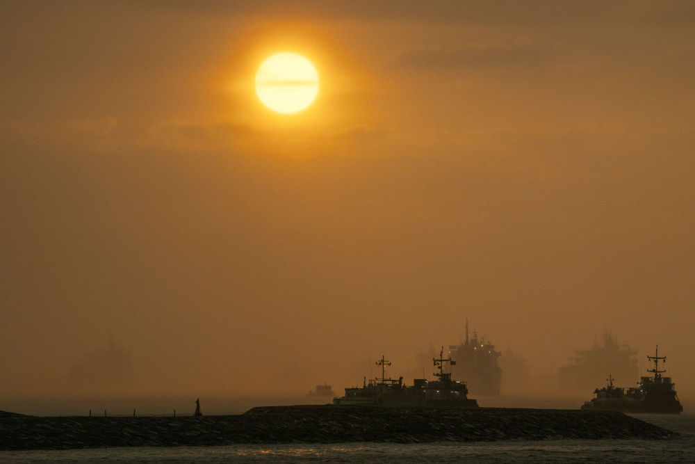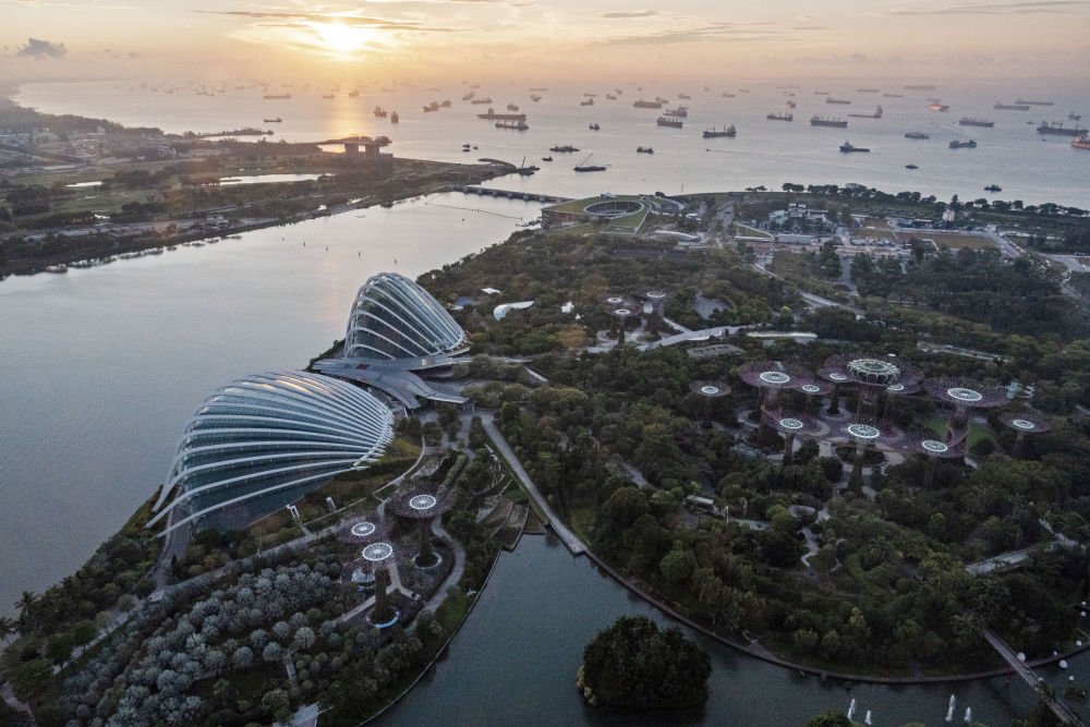 ↑商业船只停泊在作为马六甲海峡一部分的新加坡海峡。