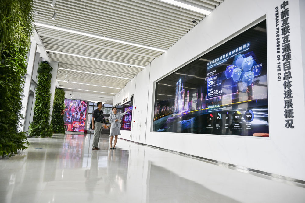 ↑人们在位于重庆来福士的中新互联互通项目展厅内参观。