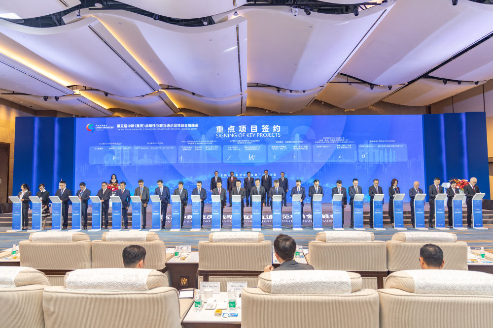 ↑2023年4月20日,重庆市第五届中新(重庆)战略性互联互通示范项目金融峰会开幕式现场举行重点项目签约仪式。