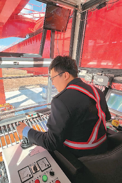 在满洲里站,龙门吊操作员进行货物装卸作业。