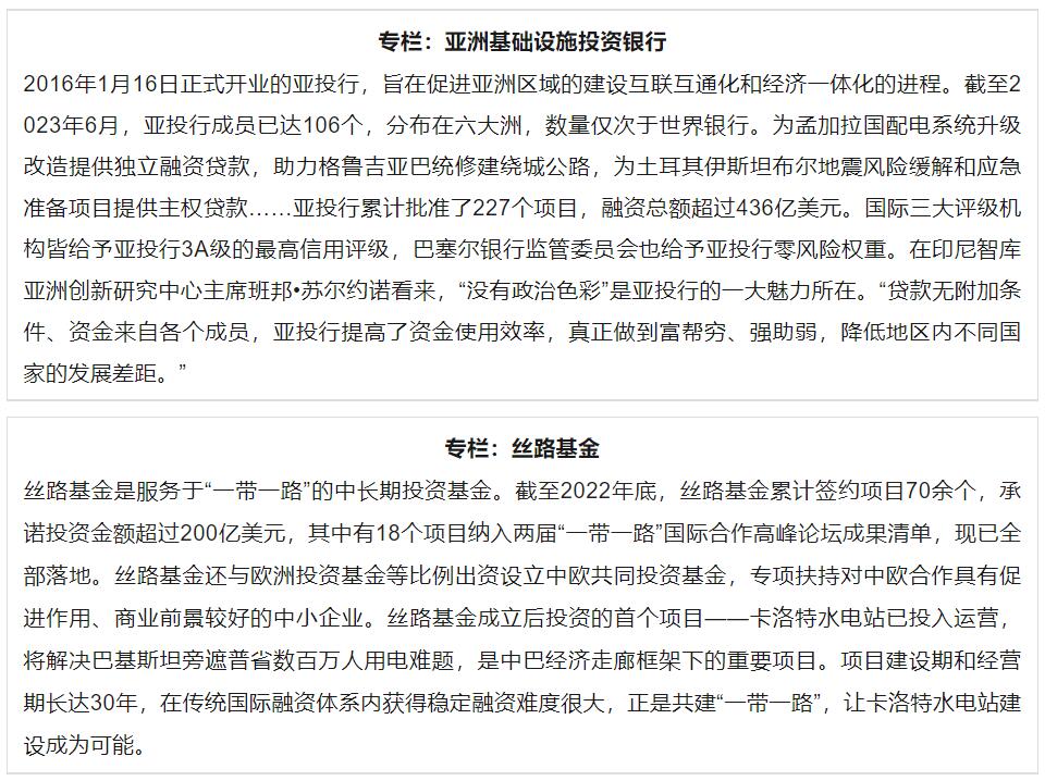 共建“一带一路”积极开拓多元化、多层次融资渠道,为新兴经济体和发展中国家经济增长“输血”。亚洲基础设施投资银行(亚投行)、丝路基金、中国开发性和政策性银行及商业金融机构,与世界银行、欧洲复兴开发银行、亚洲开发银行等多边开发机构以及国际和本地金融机构积极合作,形成透明、高效、互利的共建“一带一路”投融资朋友圈。