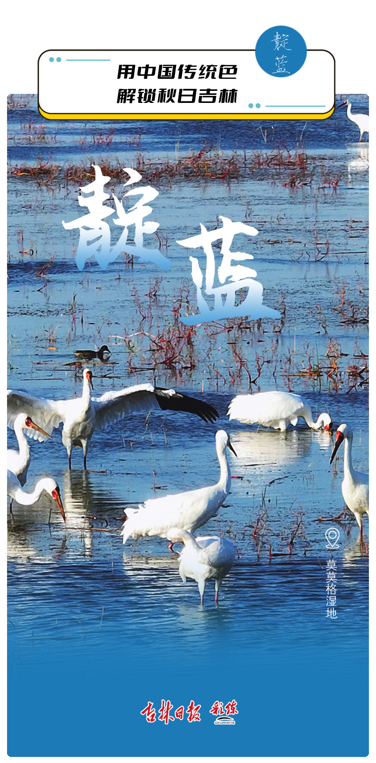 秋水天空连成一色,交相辉映,芦苇丛在靛蓝的水面上摇曳,莫莫格湿地上空,白鹤、灰鹤、大雁展翅齐飞。