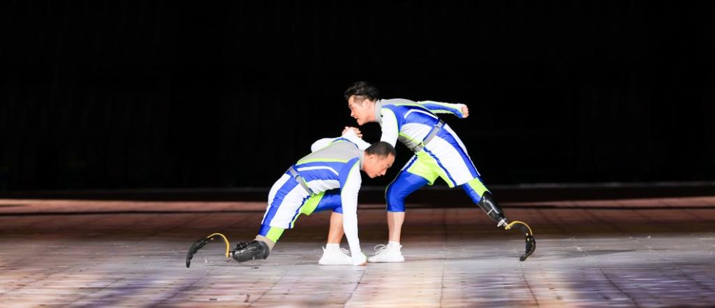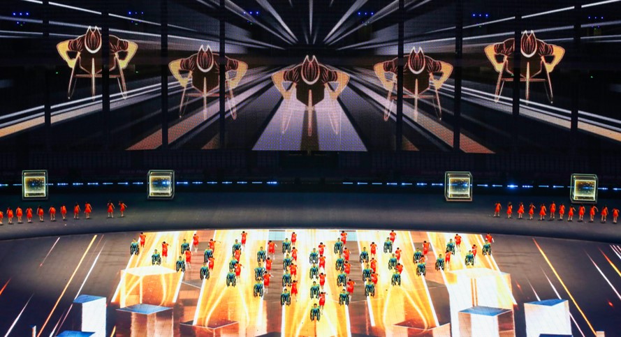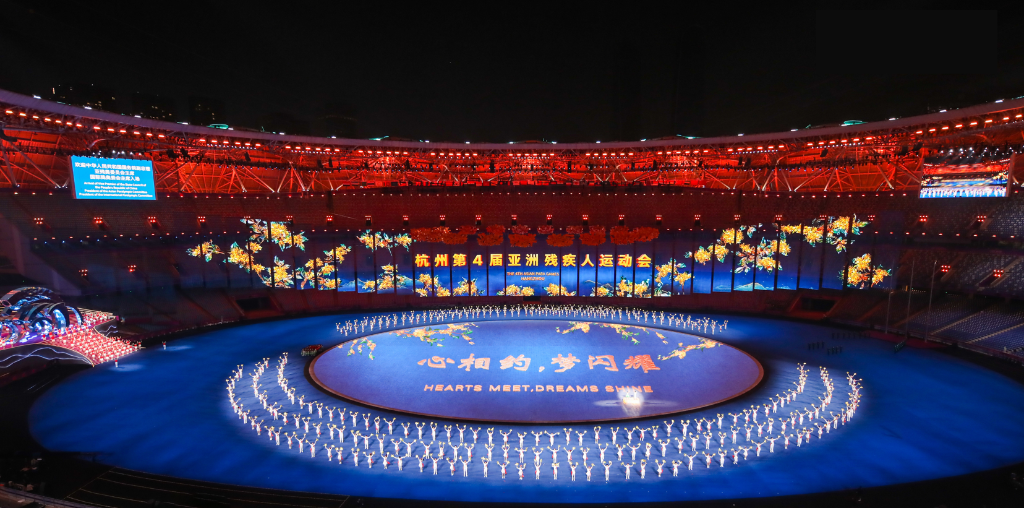 在杭州亚残运会吉祥物“飞飞”的带领下