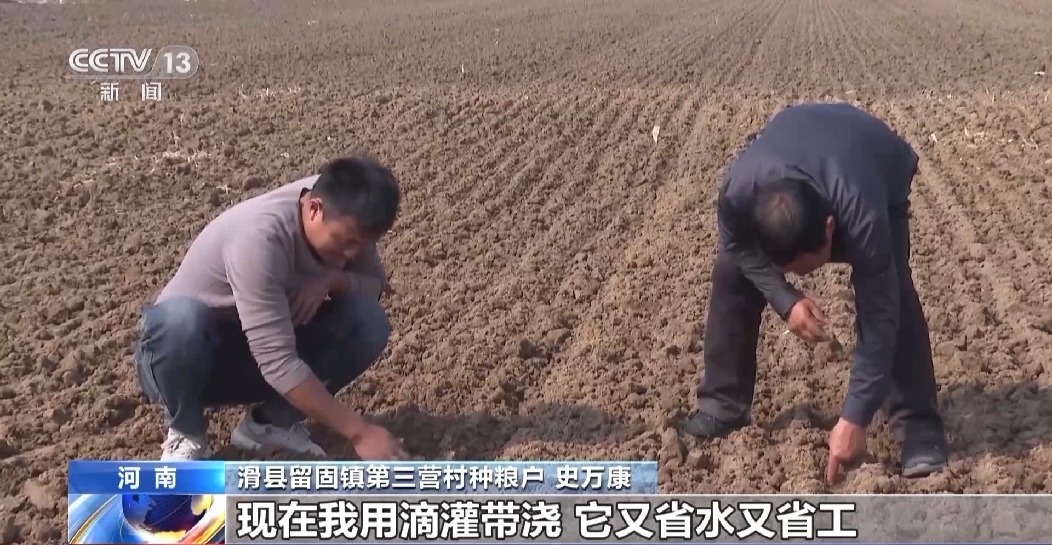 河南省滑县留固镇第三营村种粮户 史万康:现在我用滴灌带浇,它又省水又省工,就这样能增加种植的面积还减少成本,效益也提高了。