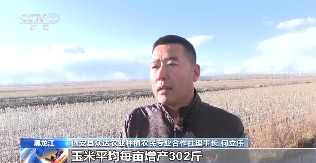黑龙江依安县众达农业种植农民专业合作社理事长 何立伟:目前看,与传统种植相比,玉米平均每亩增产302斤、大豆(增产)97斤。