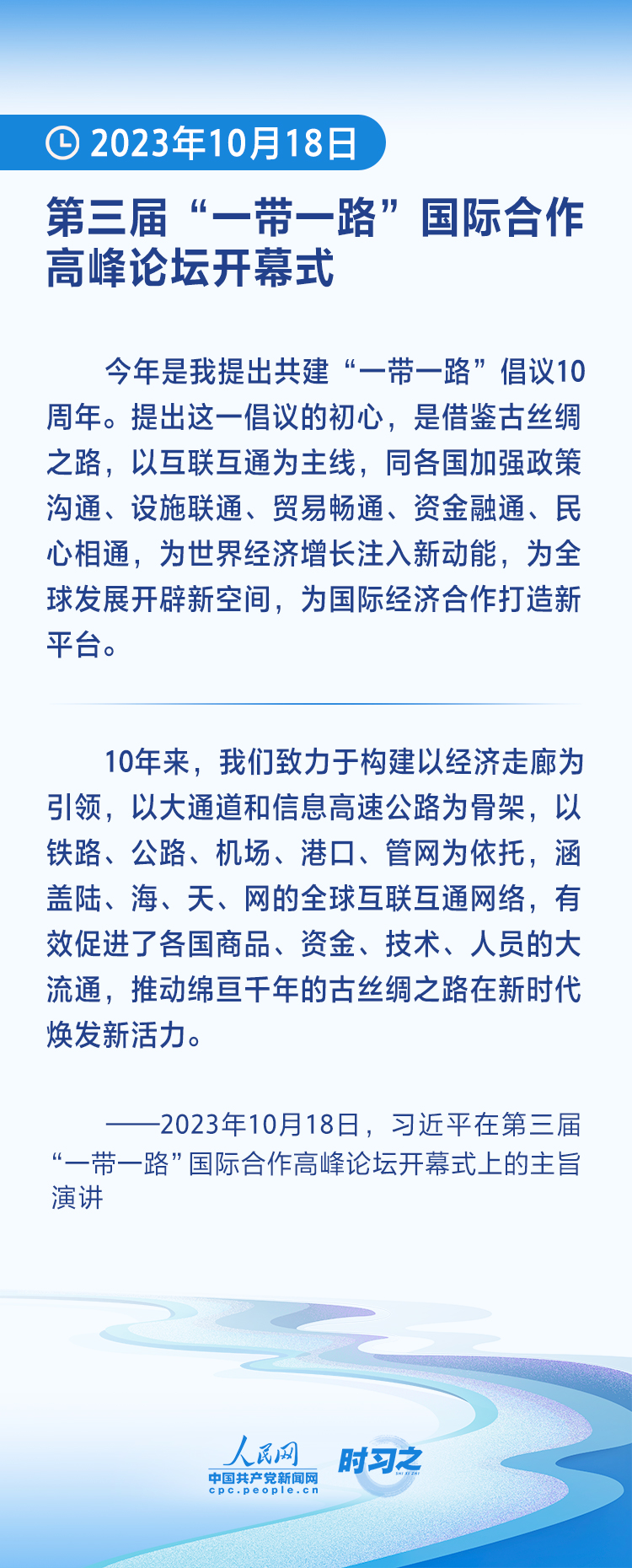 2023年10月18日上午,国家主席习近平在北京人民大会堂出席第三届“一带一路”国际合作高峰论坛开幕式并发表题为《建设开放包容、互联互通、共同发展的世界》的主旨演讲。
