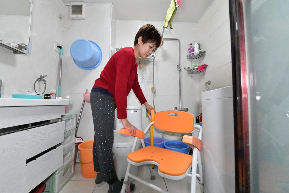 10月17日,在天津市河西区尖山街道,居民在家中卫生间内摆放助浴椅、防滑扶手等适老化改造设施。新华社记者孙凡越 摄