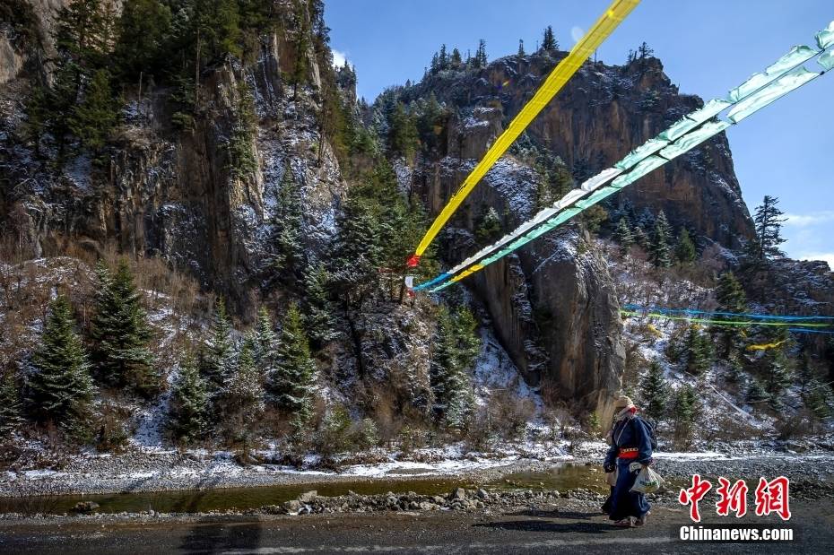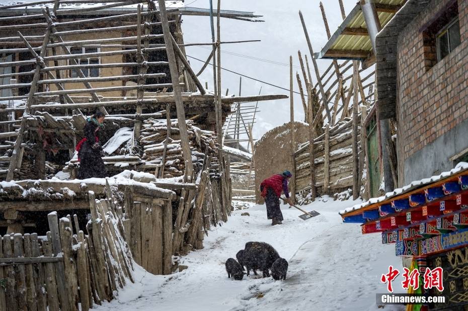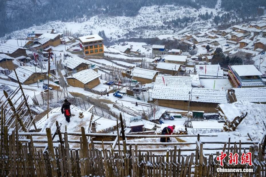 为了更好地吸引游客,政府对扎尕那村进行基础设施建设,突出藏族特色。图为冬季村民清理积雪。图/视觉中国