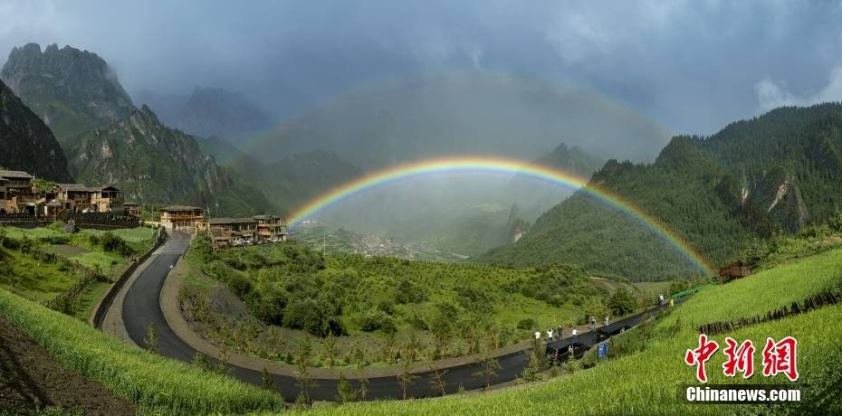 雨过天晴后的扎尕那村出现一道彩虹,吸引众多游客打卡拍照。图/视觉中国