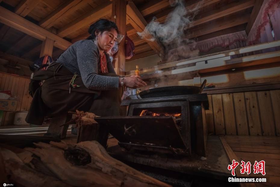 藏式民居内,客厅、厨房、火炉子和卧室都连在一起,游客可以选择住在这里赏景、品尝藏餐。图为扎尕那村妇女在制作食物。图/ICphoto