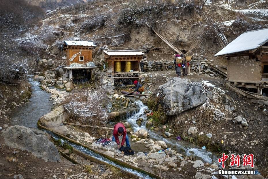 扎尕那村的藏民在村中的小河旁洗衣服。扎尕那村主要居民是藏族,纯朴善良热情好客。图/视觉中国