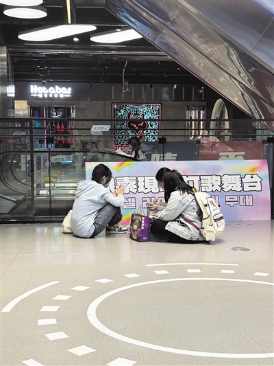 10月2日,在“小卡集市”门口,女孩们聚集在一起,整理购买的小卡。