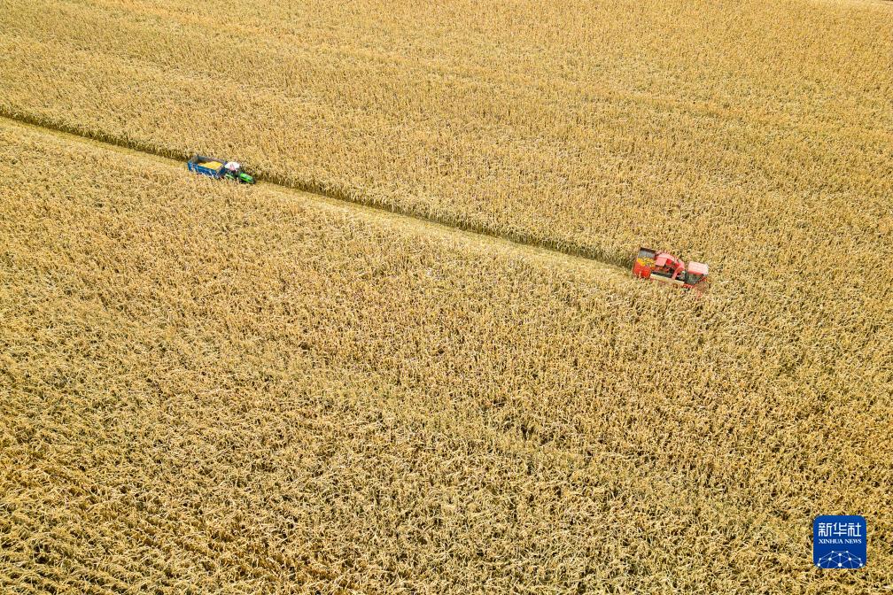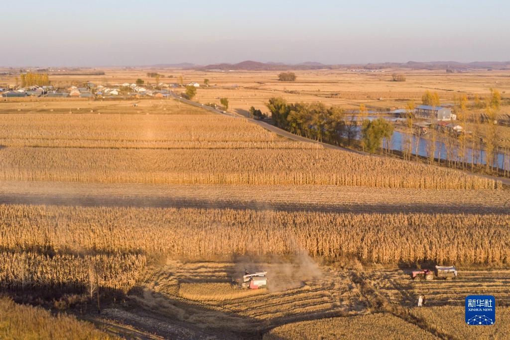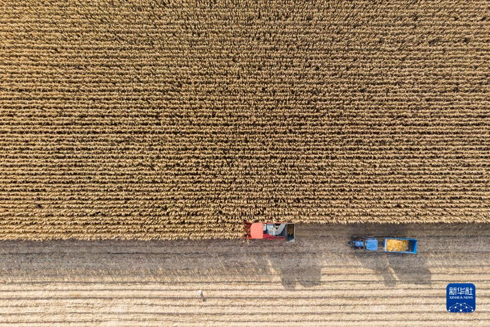 10月19日,在黑龙江省肇东市五里明镇东升村,农民驾驶收割机在收获玉米(无人机照片)。
