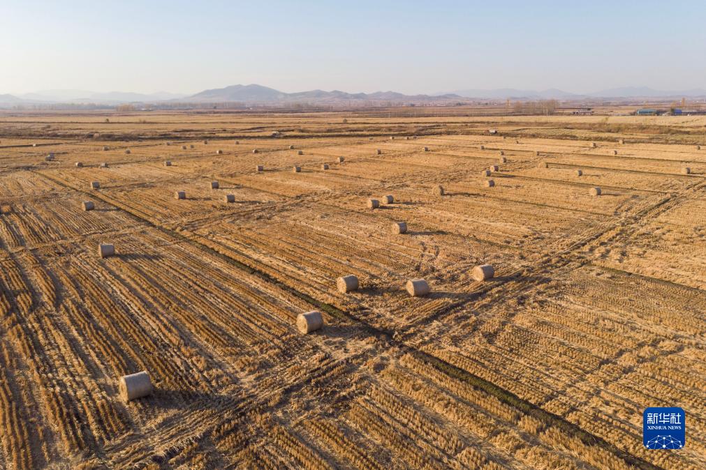这是10月18日拍摄的黑龙江省尚志市河东朝鲜族乡已收获的田地和打捆后的秸秆(无人机照片)。