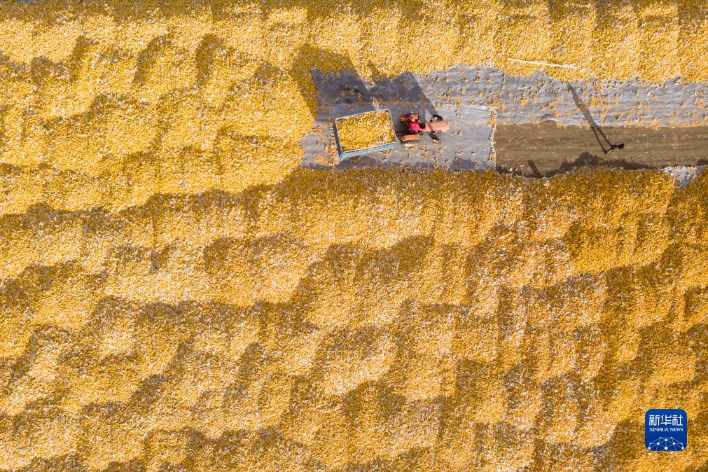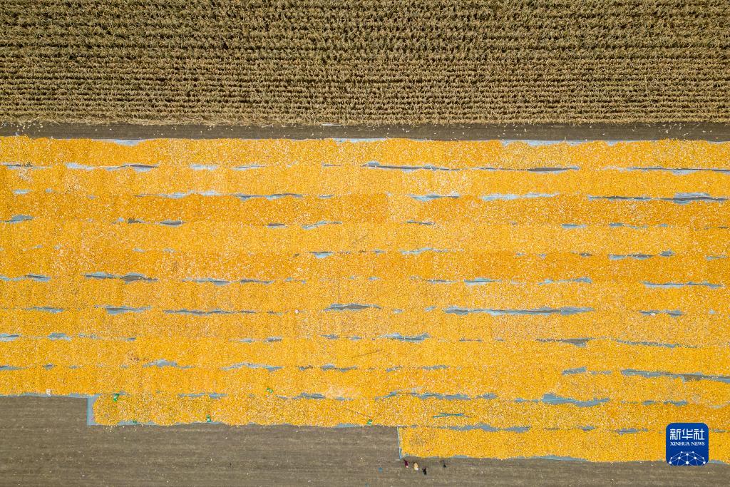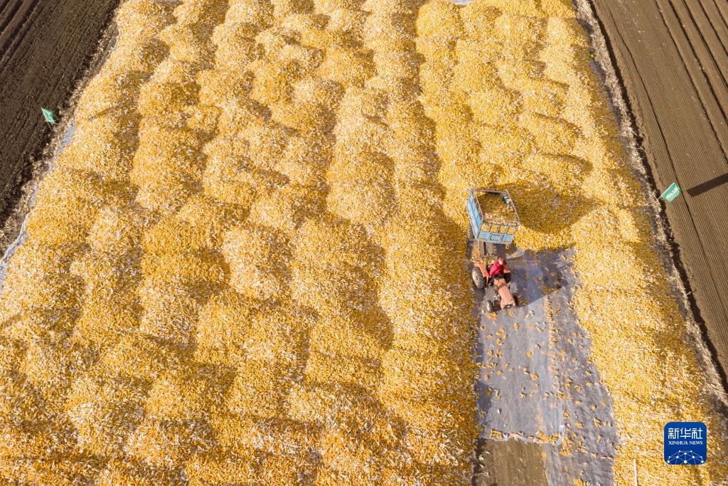 10月19日,在黑龙江省肇东市五里明镇东升村,农民把收获的玉米运到当地农业合作社指定的地点进行晾晒(无人机照片)。
