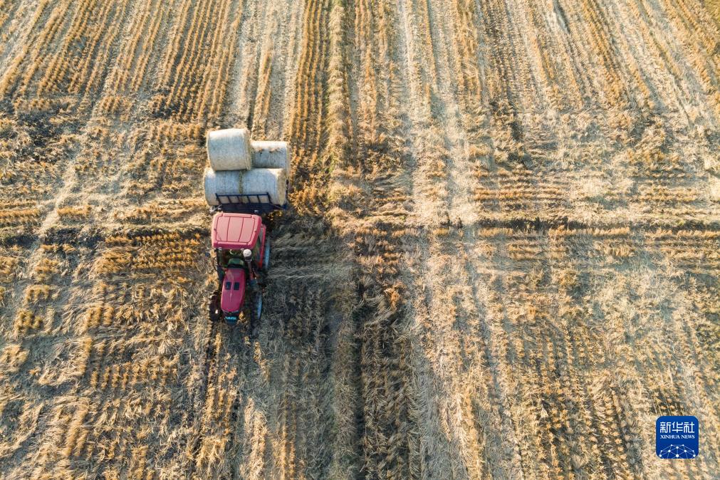 10月18日,在黑龙江省尚志市河东朝鲜族乡,农民驾驶拖拉机运输打捆后的秸秆(无人机照片)。