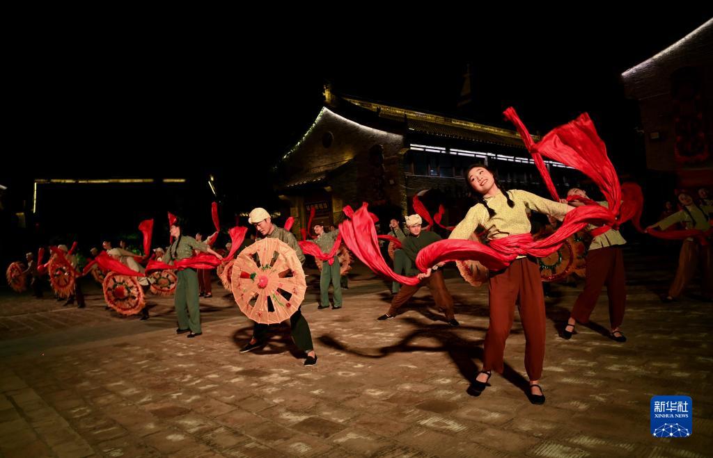 演员在陕西延安的金延安文化旅游产业园区表演红色歌舞剧《延安十三年》(2023年8月31日摄)。大型红色沉浸式歌舞剧《延安十三年》复原了上世纪三四十年代延安街景,选取当时典型人物和故事,通过技术创新手法和行进式表演为观众带来沉浸式的红色文化体验。