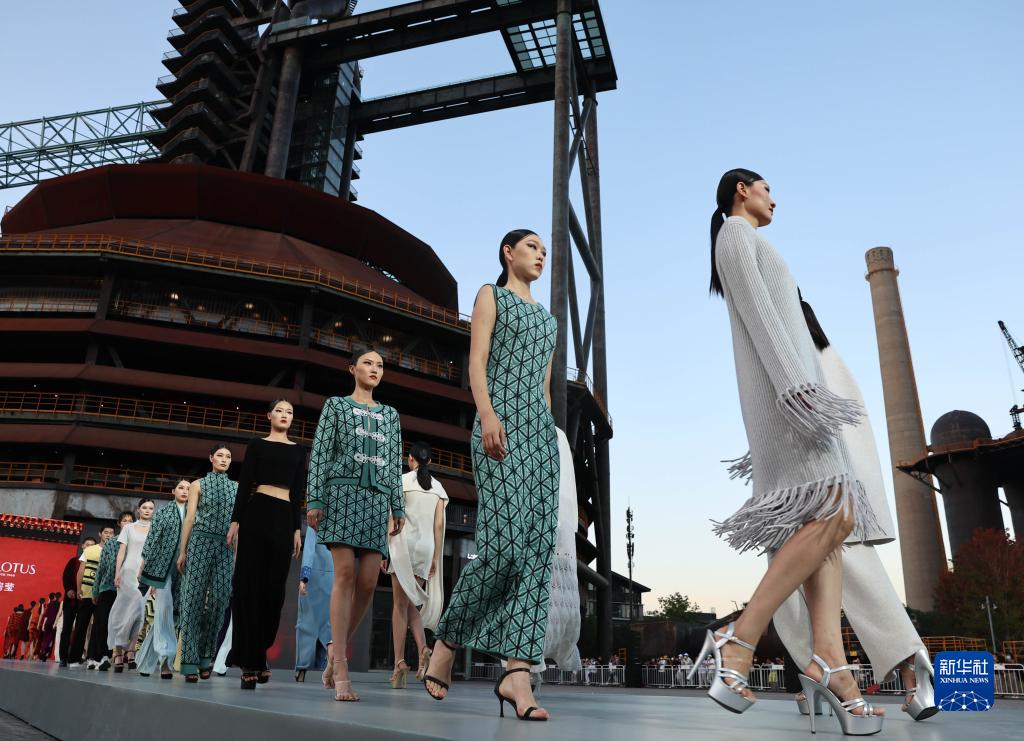 模特在北京首钢园三高炉南广场走秀(2022年9月1日摄)。首钢凝结着首都的工业记忆,经过重新设计与改造,以三高炉为代表的首钢工业地标焕发新活力,助力首都高质量发展。