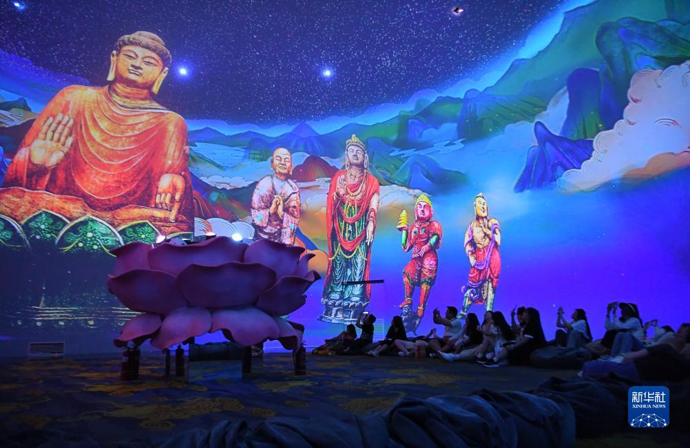 游客在河南洛阳无上龙门沉浸式体验馆观看影片(2023年6月6日摄)。洛阳大遗址保护和遗址公园建设亮点突出,一批集空间游玩、非遗体验、沉浸互动等为一体的文化场景次第涌现,优秀文创项目和产品破“圈”而出,让年轻人心向往之。