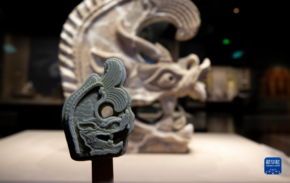 宁夏博物馆的文创产品鸱吻文创雪糕(前)与馆藏灰陶鸱吻(2022年5月16日摄)。宁夏博物馆立足自身馆藏文物,以宁夏地域特色文化为基础,成立文创产品设计研发团队,将年轻时尚元素注入文创产品中。