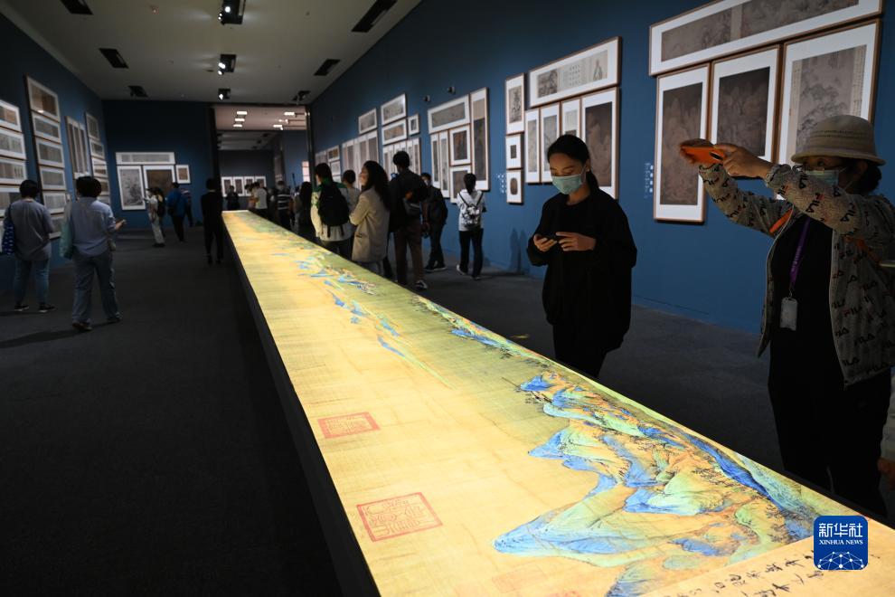 在位于北京的中国国家博物馆“盛世修典——‘中国历代绘画大系’成果展”上,观众参观放大两倍的《千里江山图》灯光特效图(2022年9月29日摄)。展览以图像、文字、视频、新媒体等多元展示手法,呈现“中国历代绘画大系”所反映的中国古代绘画的宏富成就。