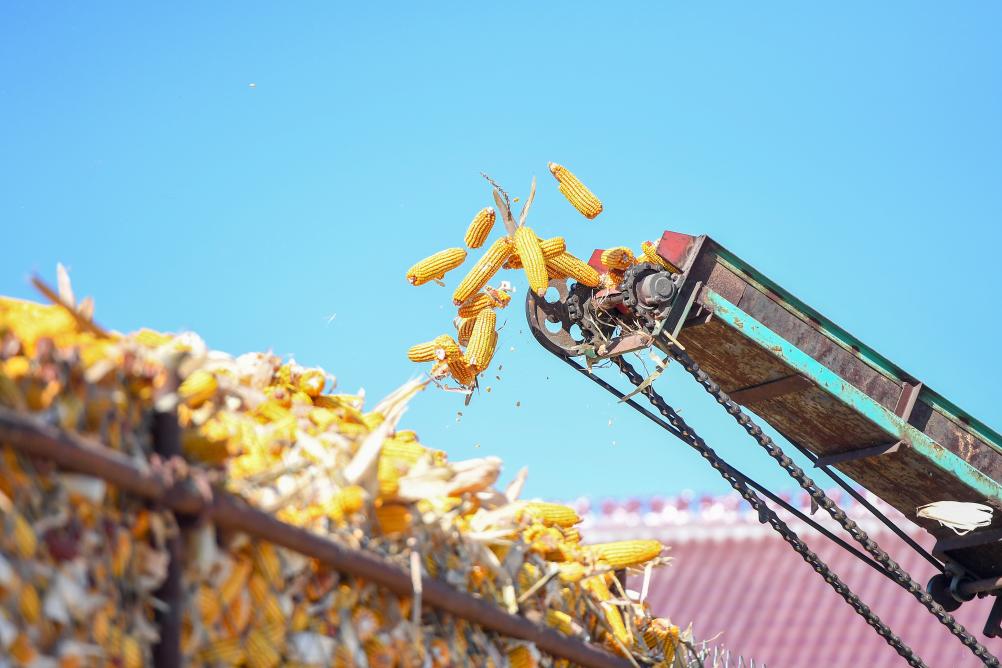 10月19日,在吉林省公主岭市友忠种植农民专业合作社,农民将收获的玉米放入科学储粮仓。新华社记者张楠 摄