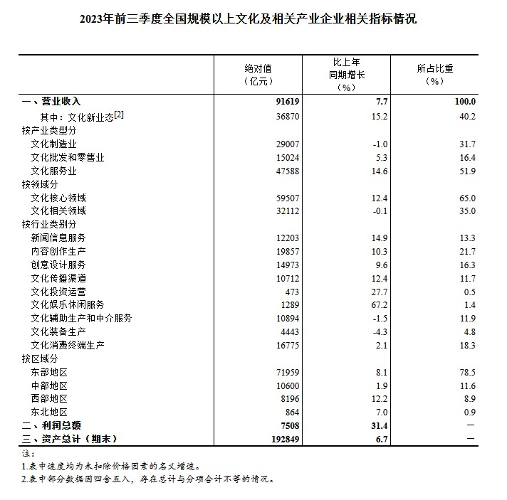 据国家统计局网站消息,据对全国7.2万家规模以上文化及相关产业企业(以下简称“文化企业”)调查,2023年前三季度,文化企业实现营业收入91619亿元,按可比口径计算(详见附注2),比上年同期增长7.7%[1]。其中,文化新业态特征较为明显的16个行业小类[2]实现营业收入36870亿元,比上年同期增长15.2%,快于全部规模以上文化企业7.5个百分点。