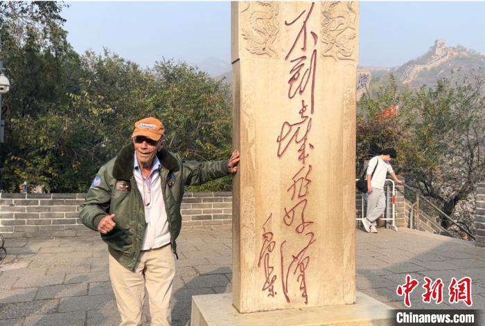 10月29日,102岁高龄的美国飞虎队老兵哈里·莫耶登上北京八达岭长城,并在“好汉碑”前竖起大拇指留影。中新社记者郭超凯 摄