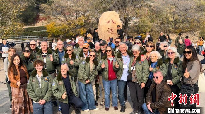10月29日,美国飞虎队老兵哈里·莫耶、飞虎队指挥官陈纳德将军的外孙女尼尔·凯乐威以及一众飞虎队老兵家属在北京八达岭长城景区合影留念。中新社记者郭超凯 摄