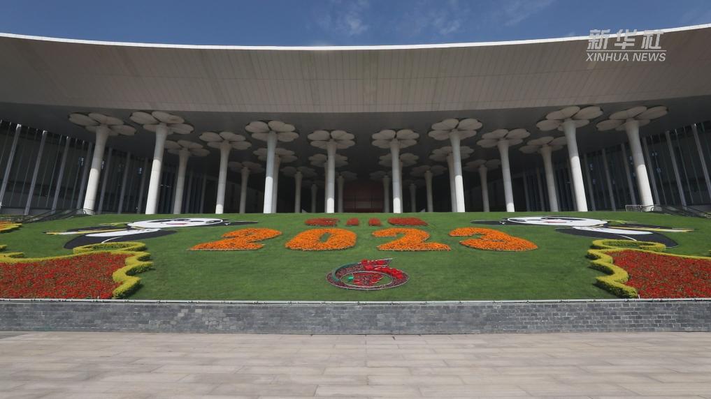 记者在现场看到,国家会展中心(上海)南广场的主体景观已基本搭建完成,以进博会六周年的主题元素设计,整体由“6”和吉祥物熊猫“进宝”组成,总体呈现出鲜明的识别度。