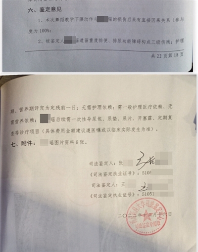 2022年12月16日,瑶瑶在西南医科大学司法鉴定中心进行了司法鉴定,鉴定意见为:本次舞蹈教学下腰动作与瑶瑶的损伤后果有直接因果关系(参与度100%)。瑶瑶遗留重度排便、排尿功能障碍,构成三级伤残。