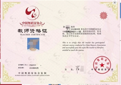 但新京报记者在山东淄博、济南、青岛等多地多家舞蹈培训机构走访了解到,现在各地校外舞蹈培训机构从业的教师,绝少持有教育主管部门印发的教师资格证,绝大多数授课教师持有的是中国舞蹈家协会等行业协会或培训机构下发的“教师资格证”。