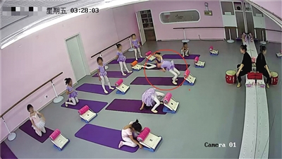 那节舞蹈课从14时开始,共有10名和瑶瑶年龄相仿的小女孩参加。从监控视频可以看到前一个小时学员们在老师的带领下主要做了压腿、伸展等动作的练习。从15时9分开始练习下腰,这是练习柔韧性的一种动作。