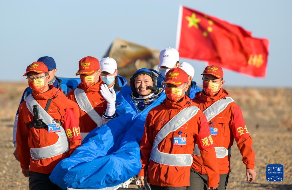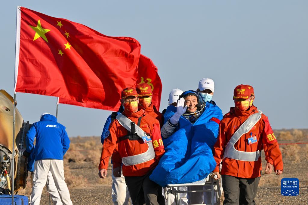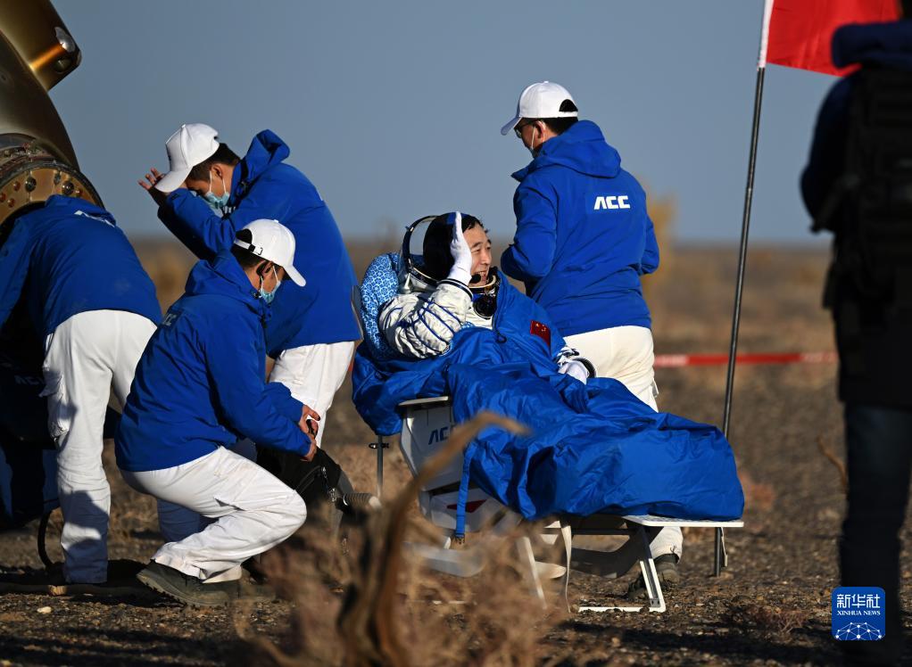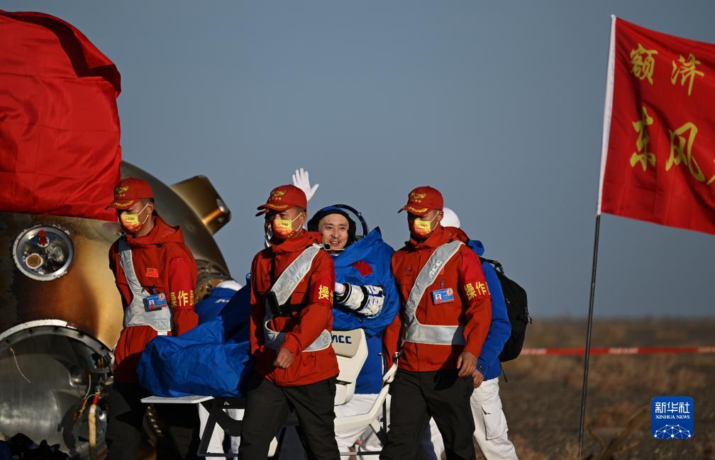 10月31日,神舟十六号载人飞船返回舱在东风着陆场成功着陆。这是航天员桂海潮安全顺利出舱。新华社记者 刘金海 摄
