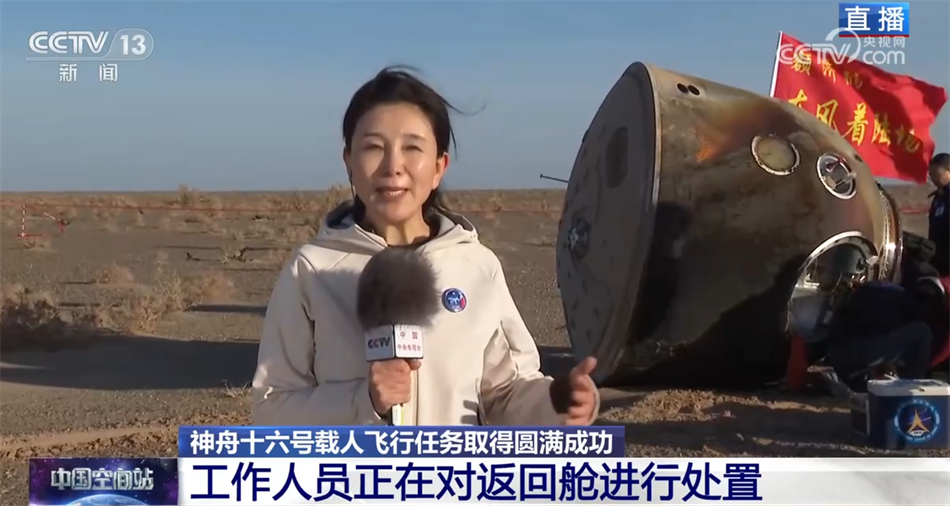 总台央视记者 刘洁:刚刚我们看到三名航天员陆续顺利出舱,然后他们进入到了旁边的医监医救车,目前他们正在进行医学监督和医学保障。现场还有一些工作人员正在对返回舱进行处置工作,对舱内气体和微生物进行采样,对有效载荷进行回收。刚刚一位工作人员告诉我说,此刻的返回舱还带着余温。利用这个时间,给大家介绍一下现场的情况。在返回舱的旁边的地面上,有2个大坑,这个是怎么产生的呢?这个是反推发动机点火推出来的。就是返回舱在距离地面还有一米左右的时候,会开启反推发动机,实现软着陆,而不是直接砸下来,这样可以使冲击力更小,航天员也会更加安全。我们今天在现场最大的一个感受就是快速和精准。返回舱顺利着陆之后,虽然我们地面分队晚到了大概十几分钟,但是空中分队是快速确定了返回舱的落点,并且精准降落在返回舱周围,做到了“舱落人到”这样的速度,非常快速和精准。