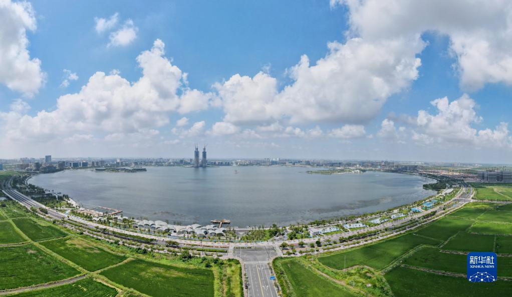这是中国(上海)自由贸易试验区临港新片区滴水湖(9月6日摄,无人机全景照片)。