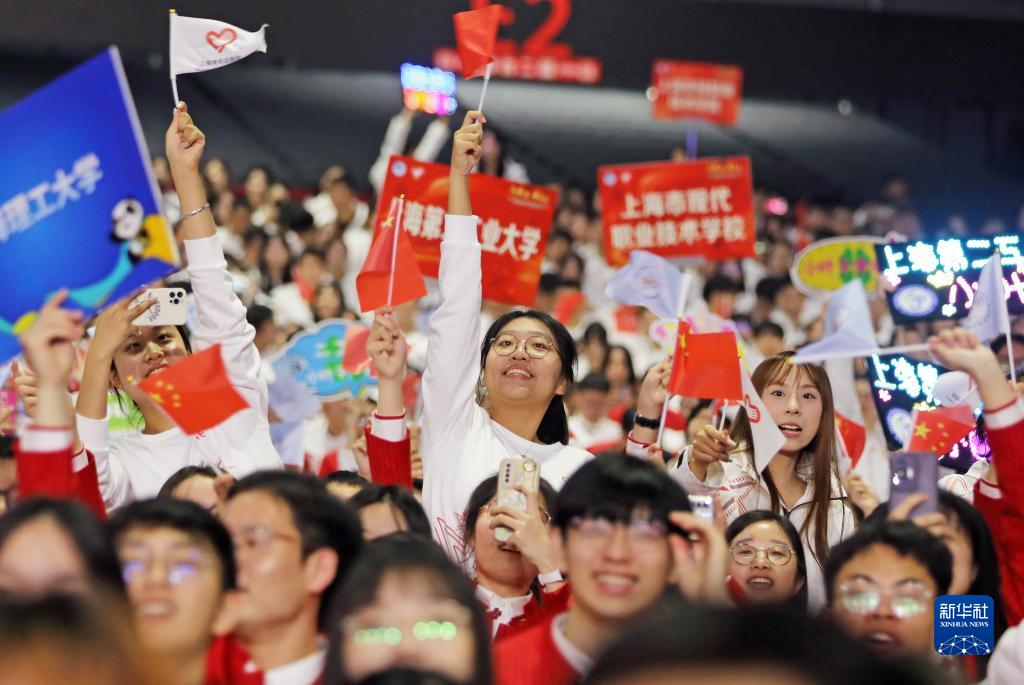 志愿者们在第六届中国国际进口博览会志愿者上岗宣誓仪式上(10月17日摄)。第六届进博会已从上海40余所高校招募会期志愿者5700余名,他们将在引导咨询、注册管理、联络接待、辅助保障、医疗卫生等岗位上开展服务。