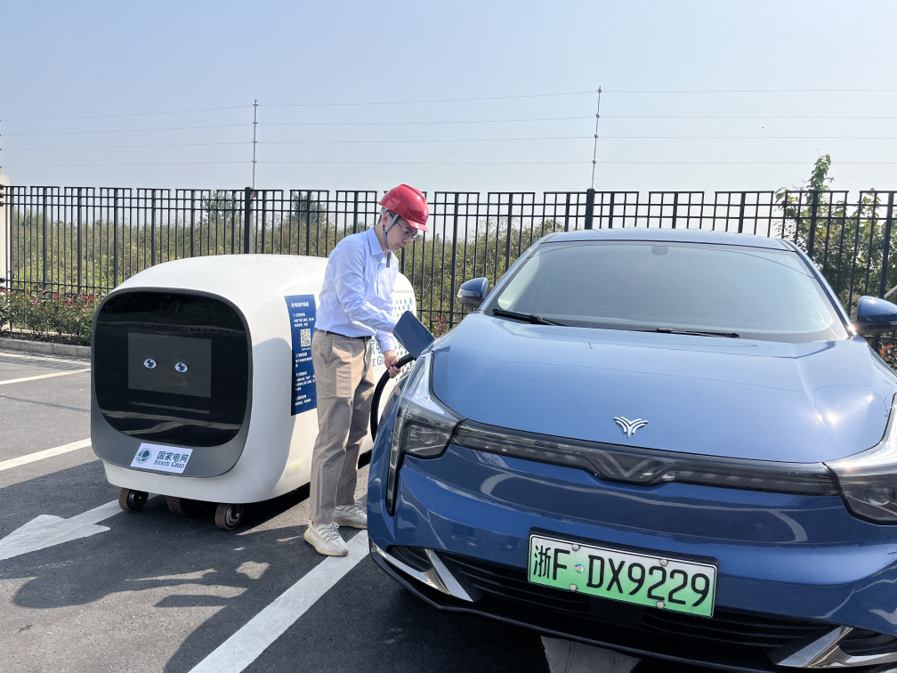 2023年10月17日,国网浙江电力工作人员在乌镇使用首台智能移动充电机器人为新能源汽车充电。新华网发 沈佳炜 摄