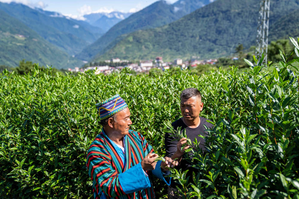 墨脱村村委会副主任达瓦次仁(右)查看茶叶生长情况(2023年10月13日摄)。新华社记者 孙非 摄