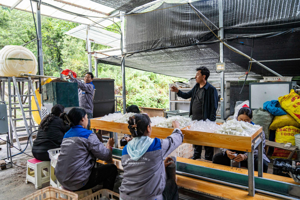 在墨脱县格当乡尼日卡林下资源种植合作社,贡秋次仁(右二)指挥工人生产菌包(2023年10月12日摄)。新华社记者 孙非 摄