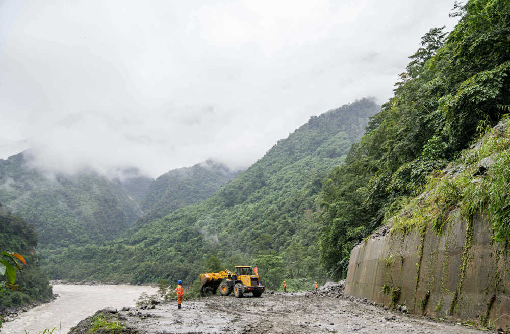 在墨脱县格当乡,工作人员在抢通道路(2023年10月12日摄)。新华社记者 孙非 摄