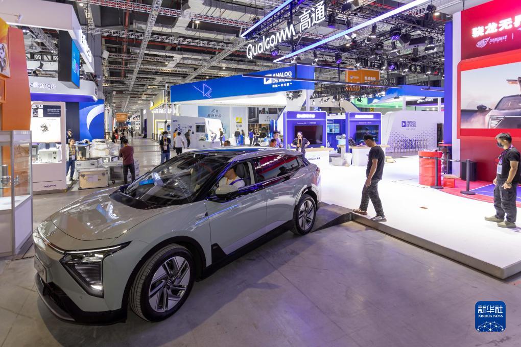 11月2日,一辆搭载高通芯片的智能电动汽车准备驶向高通展位。新华社记者 王翔 摄