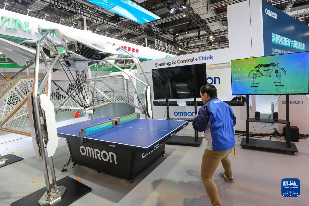 11月2日,工作人员在欧姆龙展位测试乒乓球教练机器人。新华社记者 辛梦晨 摄