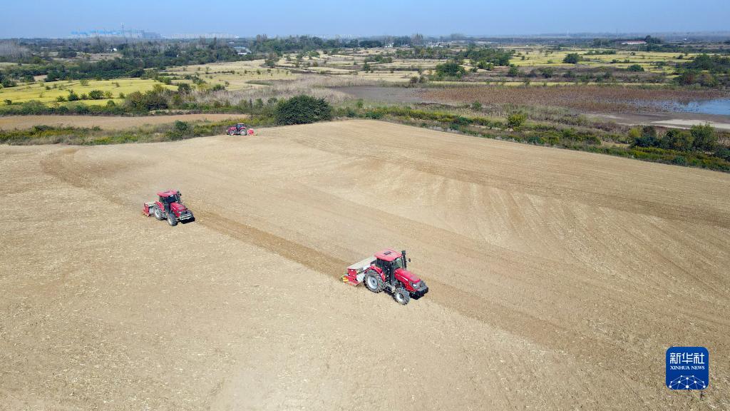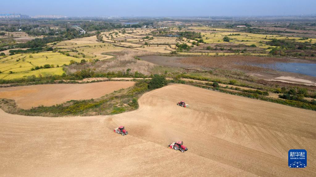11月2日,在合肥市蜀山区小庙镇,农民驾驶农机在田间播种小麦(无人机照片)。新华社记者 周牧 摄